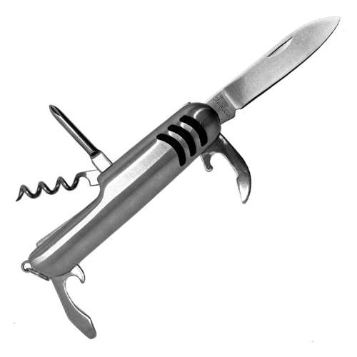 Este canivete 5 em 1 oferece ferramentas essenciais com lâmina e cabo metálico robusto. Ideal para atividades ao ar livre e uso diário.