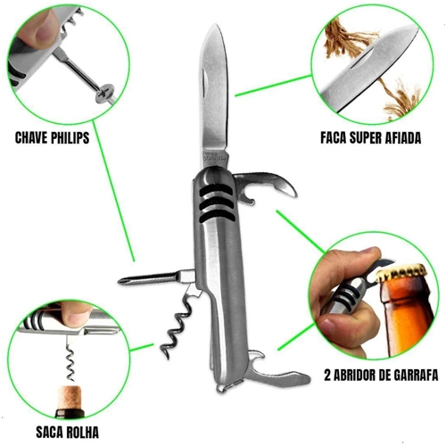 Use para cortar fios, abrir embalagens, apertar parafusos, abrir garrafas e outras tarefas rápidas em camping, indústria ou casa. Limpe com pano seco após o uso e mantenha a lâmina lubrificada para garantir seu funcionamento por mais tempo.